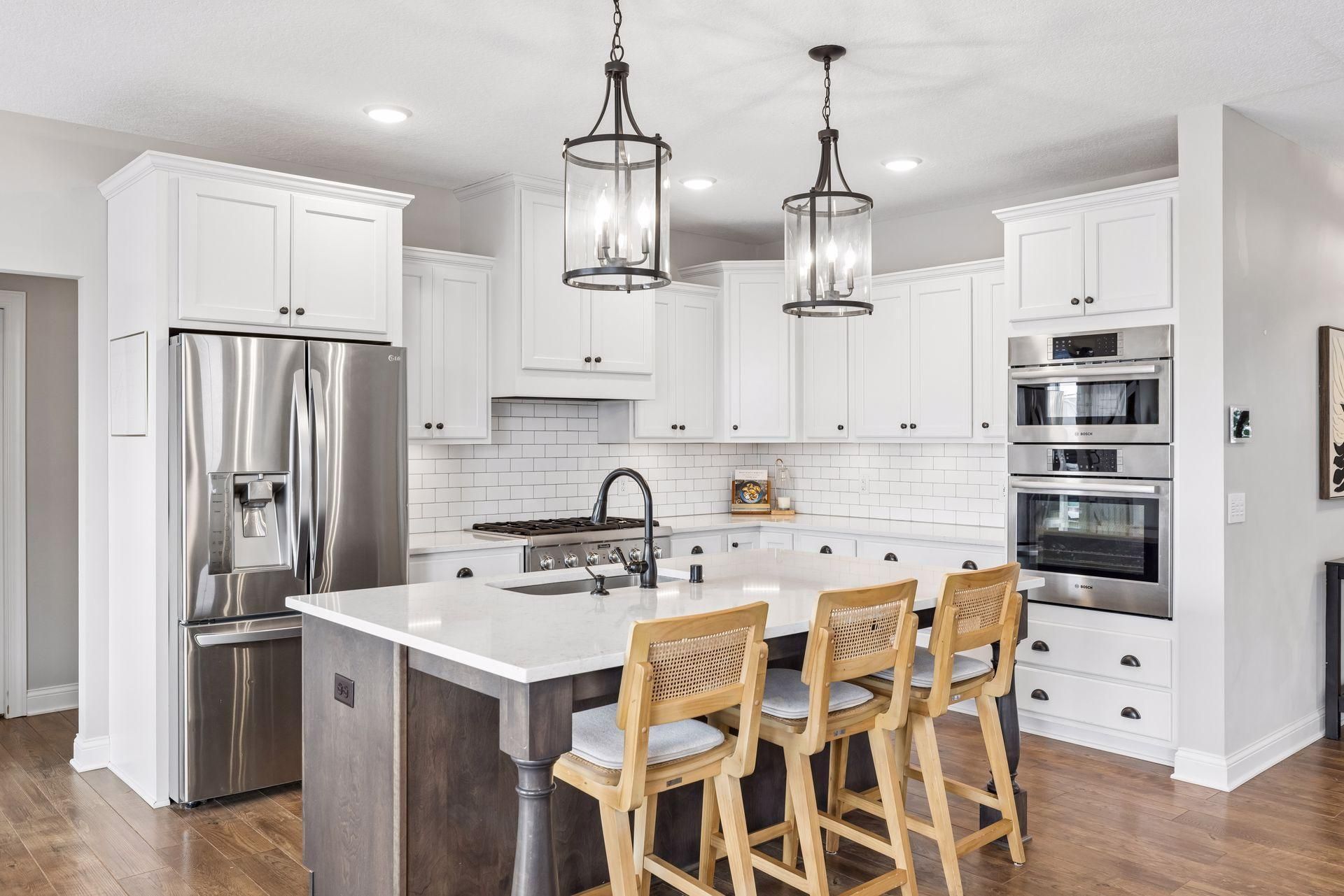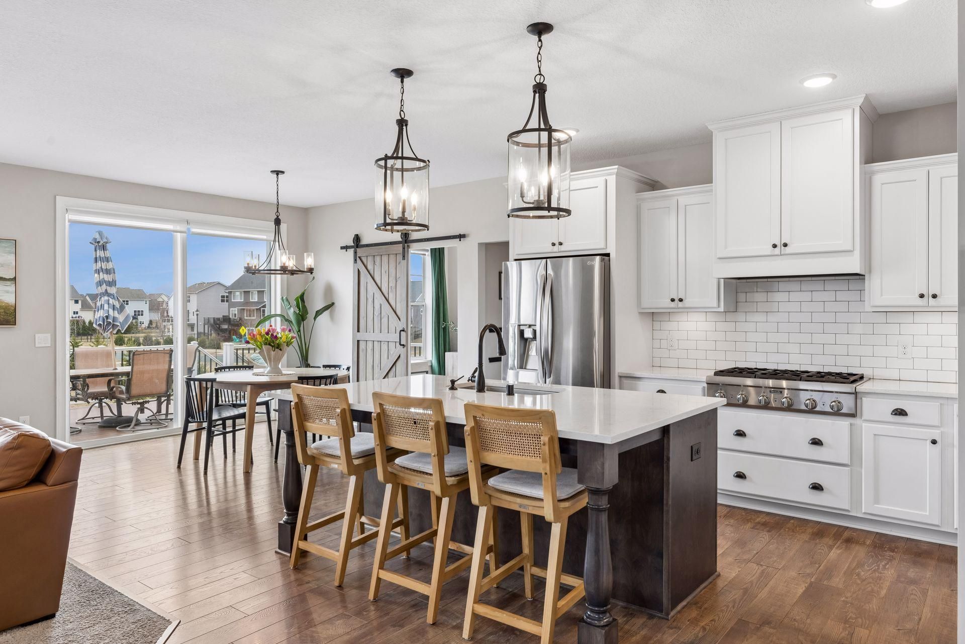 Welcome to this beautiful two-story home nestled on a quiet cul-de-sac with stunning landscaping and a serene front porch. The open-concept main floor features 9-ft ceilings, LVP floors, large windows, and two versatile flex rooms perfect for offices or additional living space. The gourmet kitchen is ideal for entertaining, offering a gas cooktop, wall oven and microwave, a large island, and a spacious walk-in pantry. Upstairs you'll find four bedrooms, a primary suite with a large walk-in closet, private bathroom with a beautiful tiled shower that features two shower heads, a loft, and convenient laundry, along with electric shades in the living room, office, primary suite, and lower level. The finished walkout basement is perfect for movie nights with built-in speakers, projector, and large screen. Enjoy the fenced backyard from the maintenance-free deck or relax on the patio below?perfect for summer evenings. Smart, user-friendly tech (Savant system) is integrated throughout with speakers on all interior levels, back patio, front porch and garage, lighting, camera system and more.