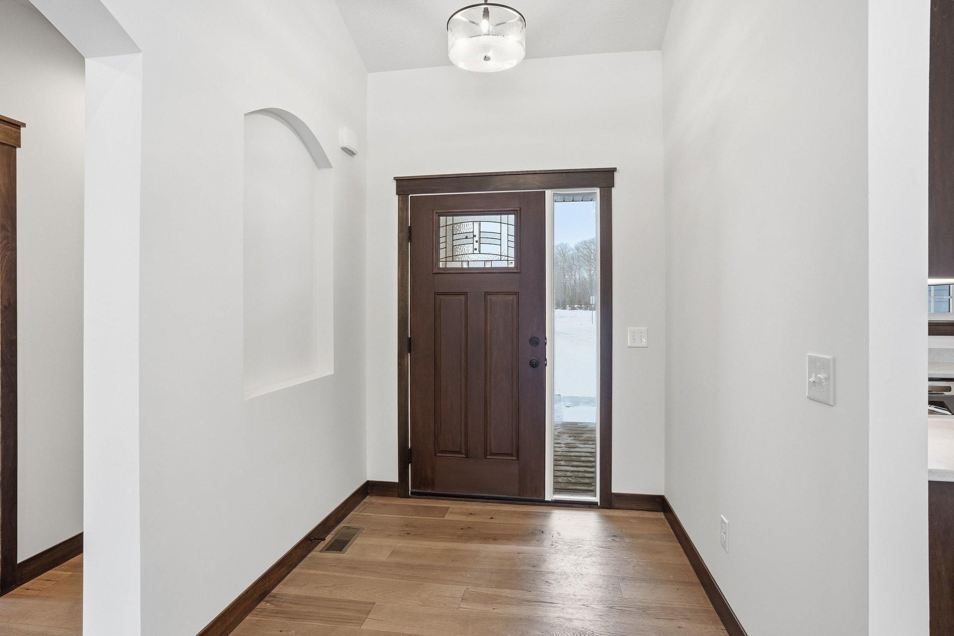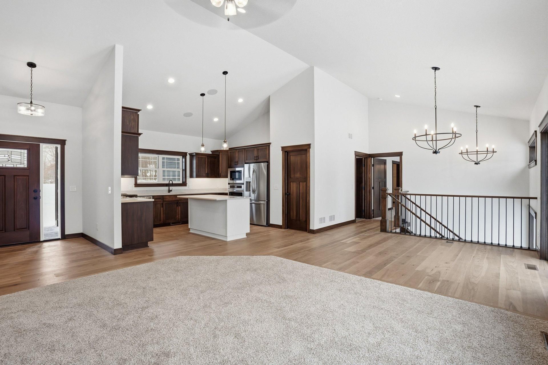 Welcome to 4282 159th Avenue NE in the highly desirable Kohler Farms development in Ham Lake, where modern design meets peaceful, spacious living. This stunning Eternity Homes Tahoe rambler offers thoughtfully designed one-level living with an open-concept layout perfect for today's lifestyle. The vaulted main living area is filled with natural light, enhanced by striking black Andersen windows and rich engineered wood flooring throughout the main spaces. The kitchen is both stylish and functional, featuring oversized modern cabinetry, quartz countertops, and a generous walk-in pantry, ideal for everyday living and effortless entertaining. Quality craftsmanship shines in every detail, from the stained, onsite-finished trim and doors to the impressive 8-foot doors on both levels. The smart split-bedroom design provides privacy, with the owner's suite set apart as its own retreat. Enjoy a seamless flow from the bedroom to a spa-like bath and into a spacious walk-in closet with direct access to the laundry room, true convenience and comfort. The finished walkout lower level expands your living space with 9-foot ceilings and large windows, creating a bright and welcoming environment perfect for gatherings, relaxation, or recreation. The oversized 4-car garage is a standout feature and is fully finished, insulated and includes a garage heater, making it ideal for car enthusiasts, hobbyists, or extra storage year-round. Kohler Farms is one of Ham Lake's newest and most sought-after communities, offering a blend of newer construction homes, spacious homesites, and a serene setting surrounded by nature. Residents enjoy a quiet, neighborhood feel while still being within easy reach of everyday conveniences. Living in Ham Lake means embracing a lifestyle that balances tranquility and accessibility. The area is known for its abundant green space, lakes, and outdoor recreation. Spend weekends exploring nearby parks, trails, and golf courses, or enjoy local favorites like Ham Lake Park and Majestic Oaks Golf Club. With a strong sense of community, local events, and convenient access to shopping, dining, and major commuting routes, Ham Lake offers the perfect place to call home. If you're looking for a beautifully crafted home in a growing community that offers space, privacy, and a connection to the outdoors, this Kohler Farms rambler is a must-see.