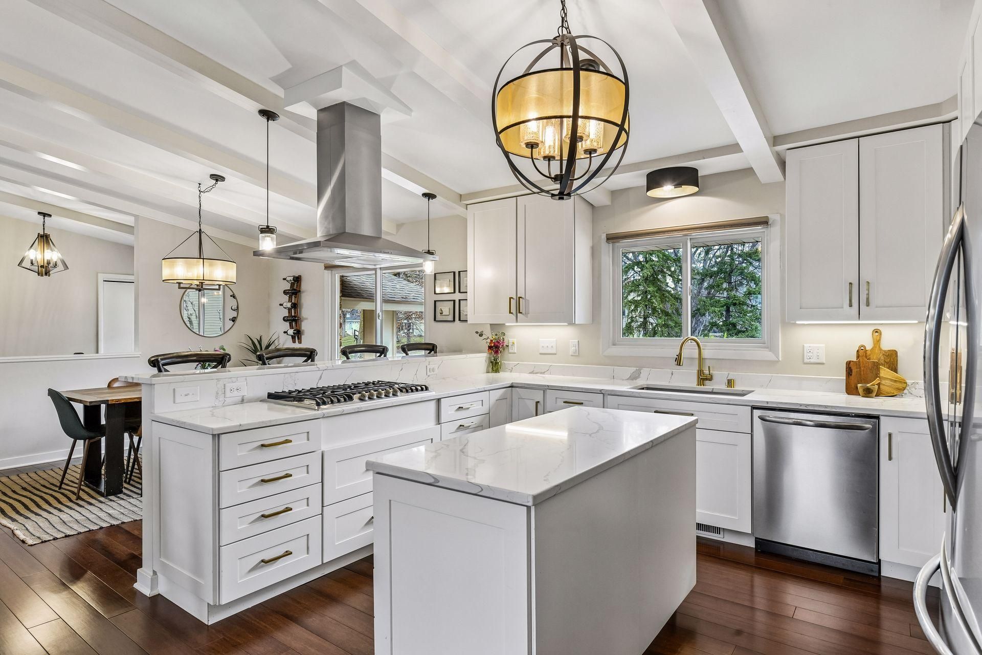 This spacious rambler features five bedrooms and three bathrooms, ideally situated on a private cul-de-sac lot. The main level showcases vaulted ceilings and an open flow between the renovated kitchen, dining room, living room, and family room, anchored by a double-sided brick fireplace. The primary suite offers a private three-quarter bath, while two additional bedrooms and a full bathroom complete the main floor. The walkout lower level expands the living space with a large family room, fireplace, new entertaining bar, game area, home gym, and two additional bedrooms. Additional highlights include a two-car garage, extra side parking space, and private deck and patio. Located in the award-winning Minnetonka School District and just steps from the Lake Minnetonka Regional Trail. Home improvements under current ownership include: replacement of all windows in 2018 and 2025 (excluding the small gym window and two garage windows); new sliding glass door, bathroom vanity, and storage shed (2025); driveway replacement with the addition of a third exterior parking space (2024); mudroom remodel (2023); lower-level bar addition, hot tub with electrical, and new roof (2020); new staircase railing (2018); and installation of a smart thermostat, garage door opener, keyless entry, exterior Ring cameras, and three new closet doors. Exterior siding was replaced in 2018 by previous owners.